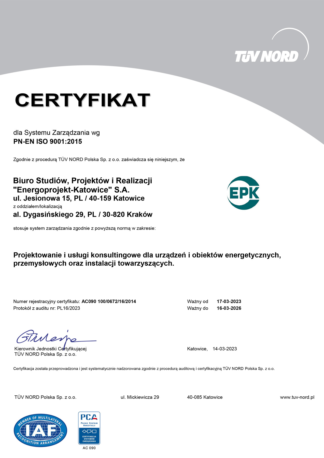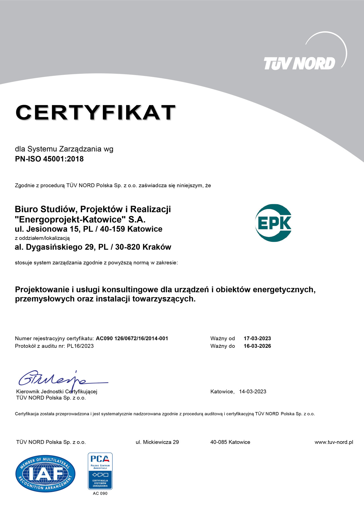ENERGOPROJEKT-KATOWICE S.A., a company providing quality design and consulting services for equipment, power and industrial plants and related facilities, has implemented, maintains and continuously improves IMS based on the requirements of Quality Management (PN-EN ISO 9001:2015), Occupational Health and Safety Management (PN ISO 45001:2018) and elements of Environmental Management (PN-EN ISO 14001:2015).